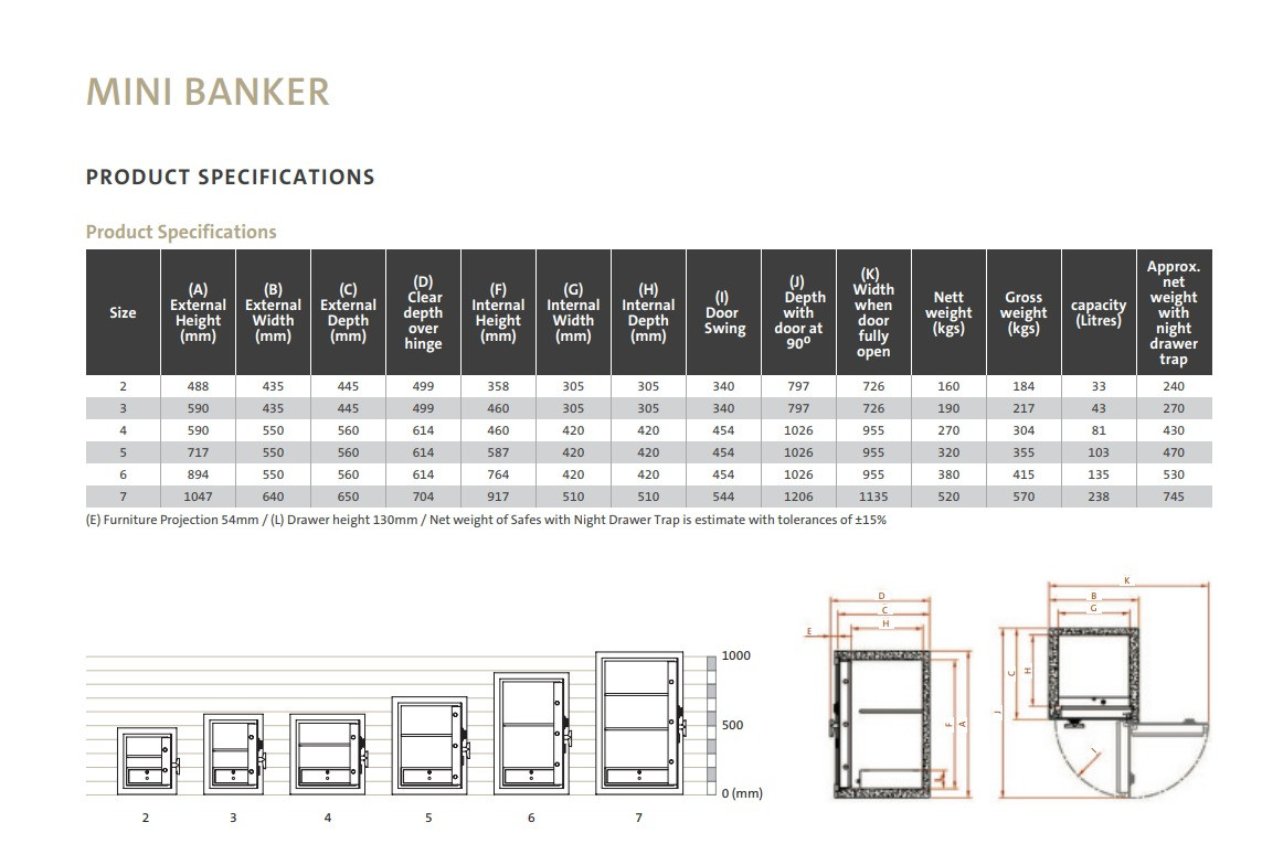 Mini Banker’s body has an effective barrier thickness of 65 mm, filled with a specifically formulated Chubbsafes F60 barrier material. The overall door thickness of 88 mm is incorporating a 9 mm solid steel plate. The front of the door is secured to the body by front moving bolts.